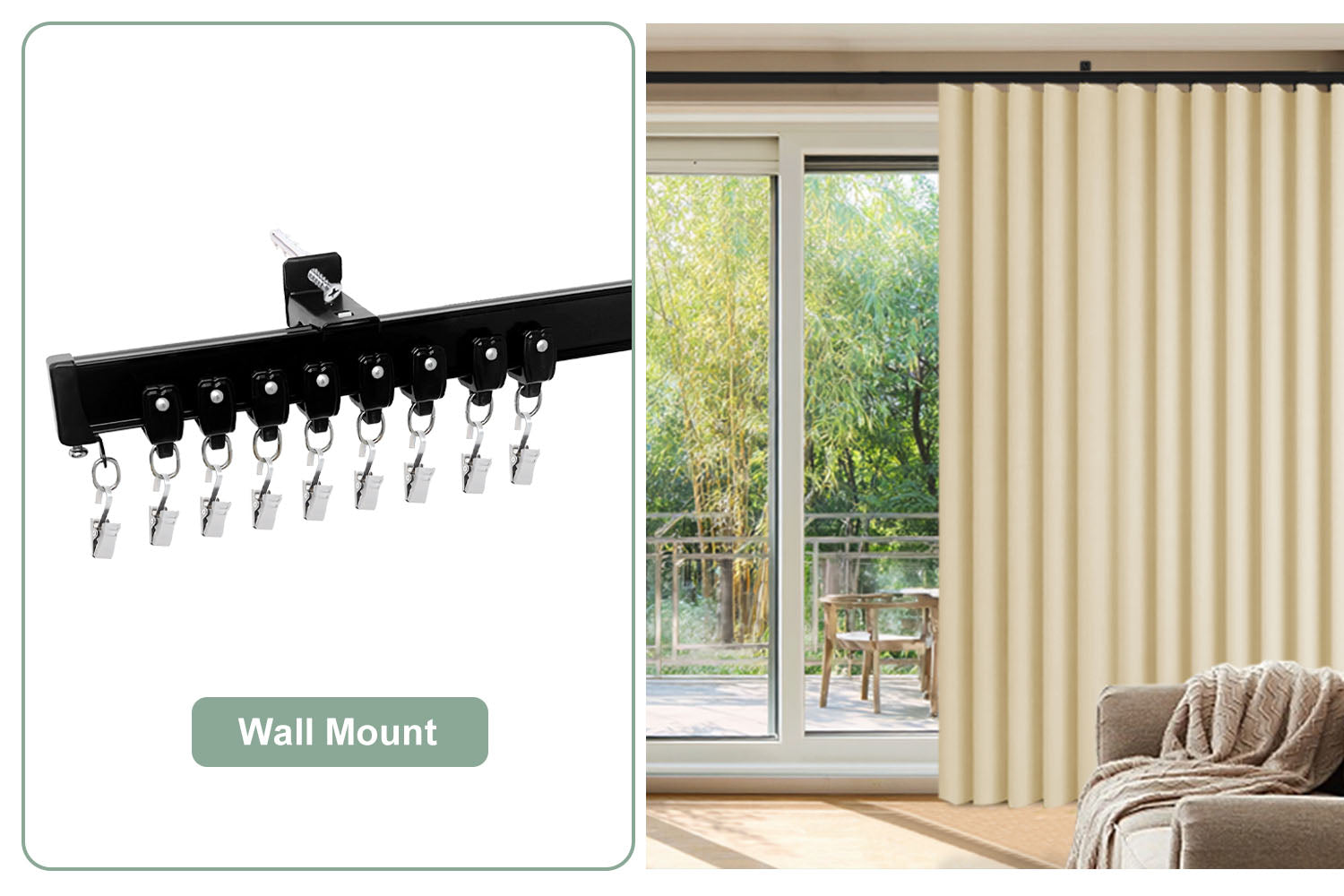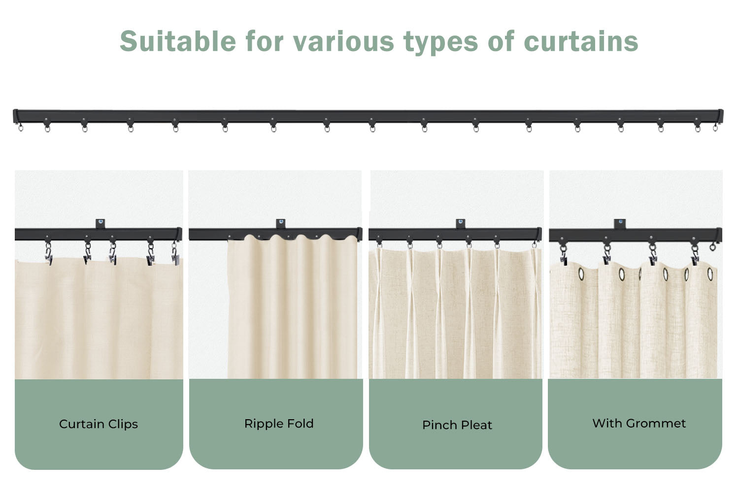 The black and white curtain tracks all use high photoelectric coating technology, so that the surface and interior of the track are very smooth and perfect, easy to slide,Ceiling mounted/wall mounted tracks suitable for room divider curtains, home, office, school, hospital, shower,hotel, outdoor, RV privacy, space partition or holiday decoration.