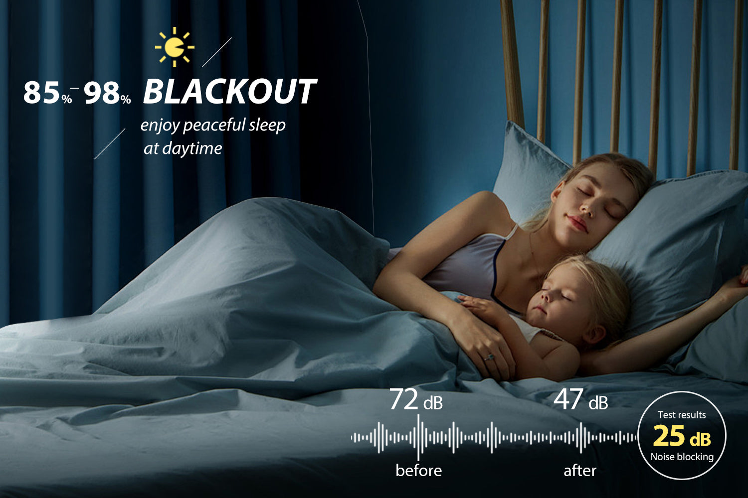 High-density fabric blocks out 98% of light and ensures a private, restful sanctuary.