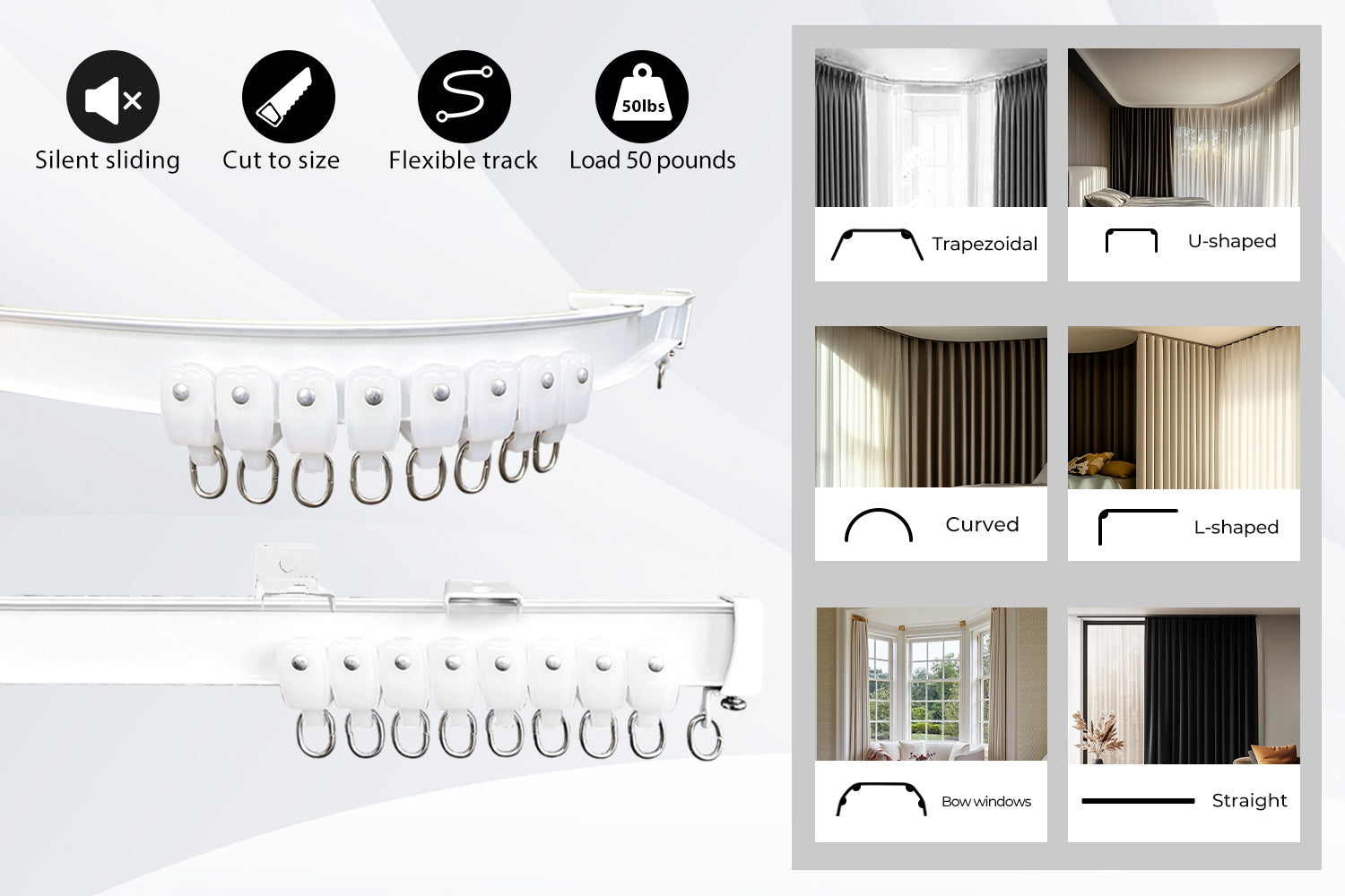 - Bendable Curtain Tracks: Ceiling curtain track rails are very flexible and can keep straight, while they can be bent into trapezoidal, arc, L-shaped, arc-shaped, etc,Very easy to bend and doesn't require any tools. suitable for any window and ceiling room partition and window track