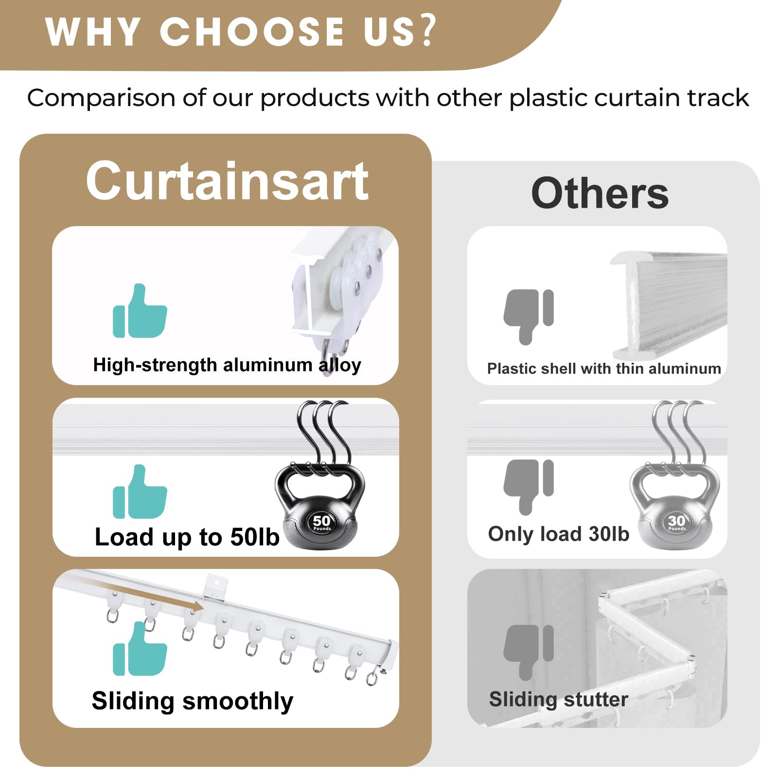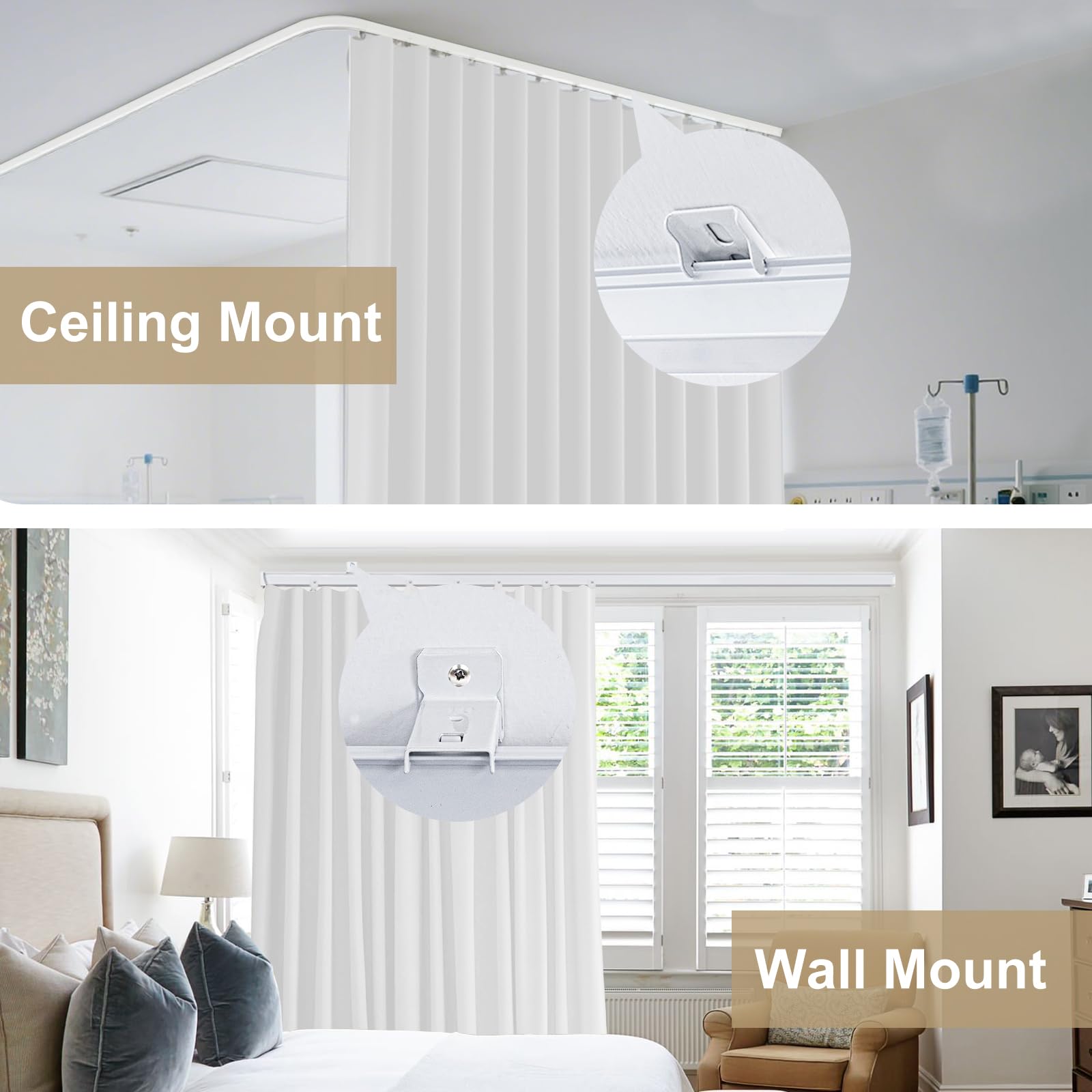 - Ceiling Curtain Track: Metal heavy-duty curtain track has the functions of silent, sturdy, waterproof and anti-corrosion, and can be cut freely to size. The bendable flexible track surface is highly glossy sprayed with a smooth glide that can carry up to 50 pounds. Curtain Track Including mounting brackets and connectors made of thickened aluminum alloy,they are very strong and durable