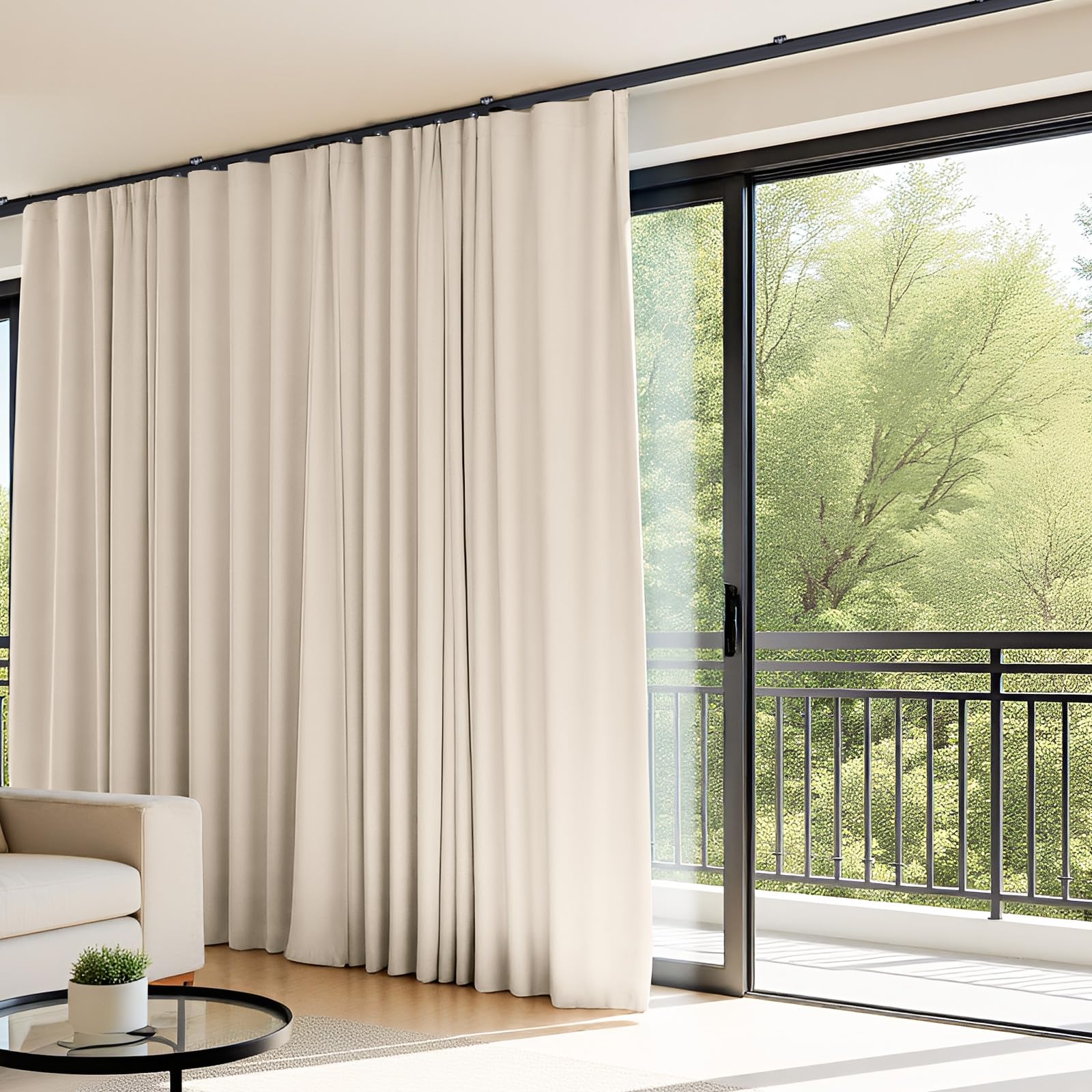 (Beige)High-Density Silk-Look Blackout Divider Curtain & Black Track Kit