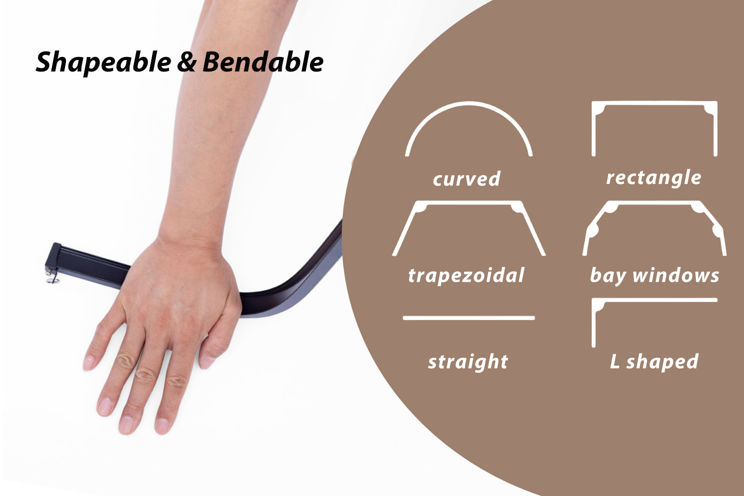 The curtain track is made of lightweight aluminium alloy. Simply hold the curtain track in front of your knees and bend back with both hands, bending slower to prevent it from deforming too quickly.