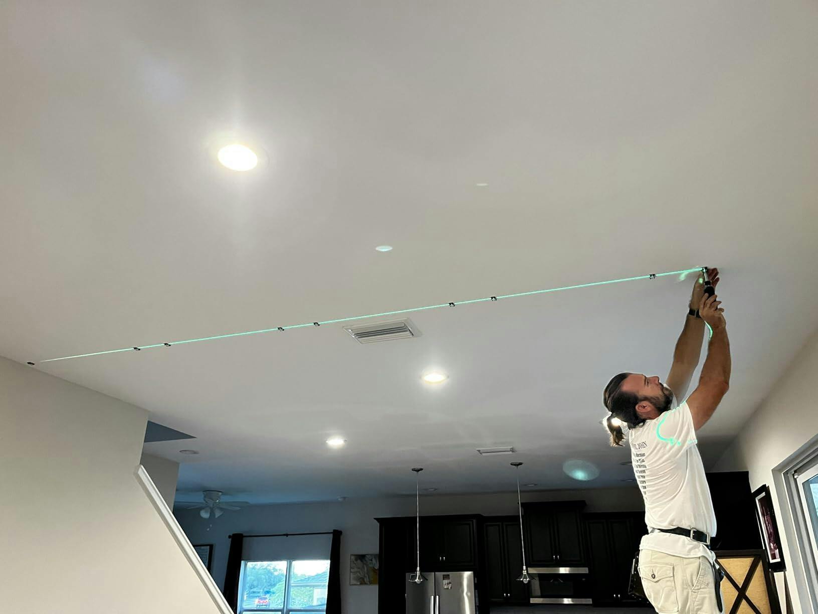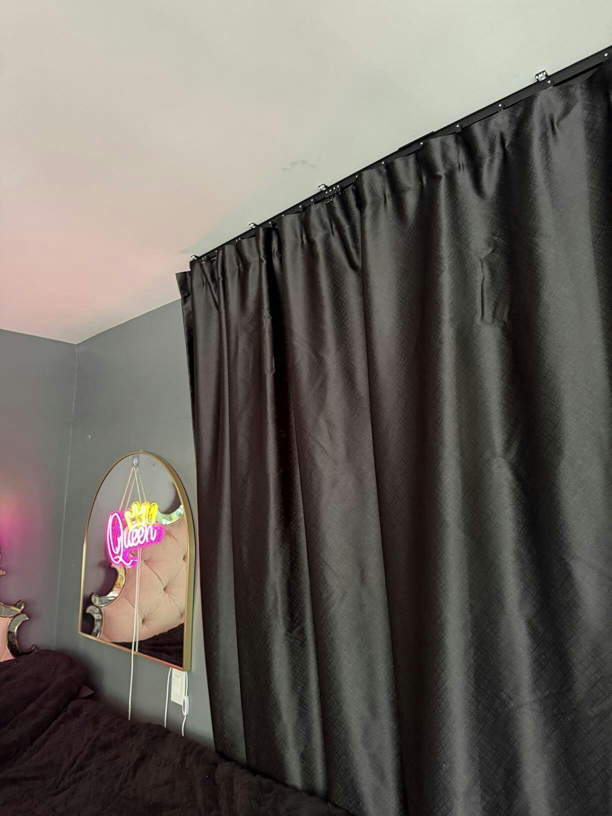 Awesome room divider curtain with ceiling track. Super simple to put up even a girl can do it because I did. I was a little hesitant to start this project as I thought it would be hard to get this track installed on the ceiling. But boy was I wrong it was just so simple. I drew a line across the ceiling for where I wanted my truck to go. Combined the track with the pieces provided. Then installed the ceiling holders which were just each individually put up with one screw. I cannot believe how easy this was to install and how amazing it looks. I am absolutely loving it. I really love that the end pieces come with an extra hook where you can hook your curtain too if you want the curtain to state wide open and not scroll back-and-forth. Which I do so I love that function.