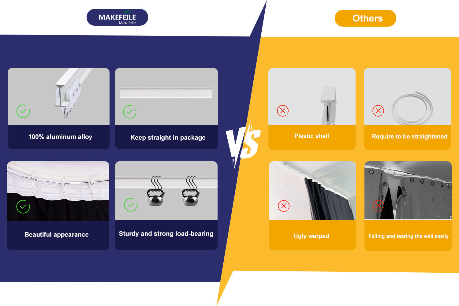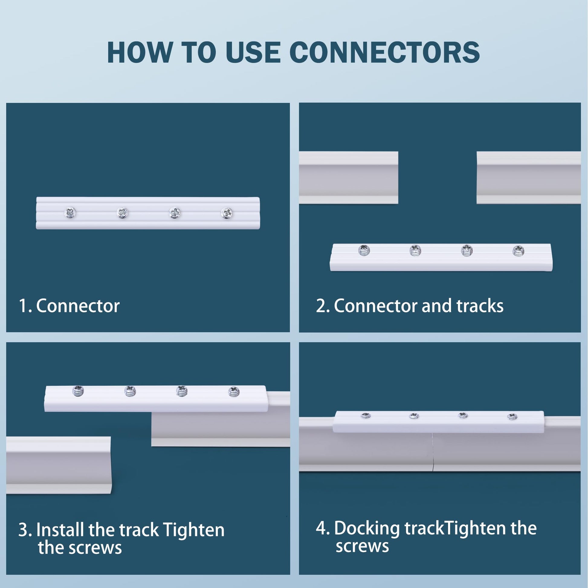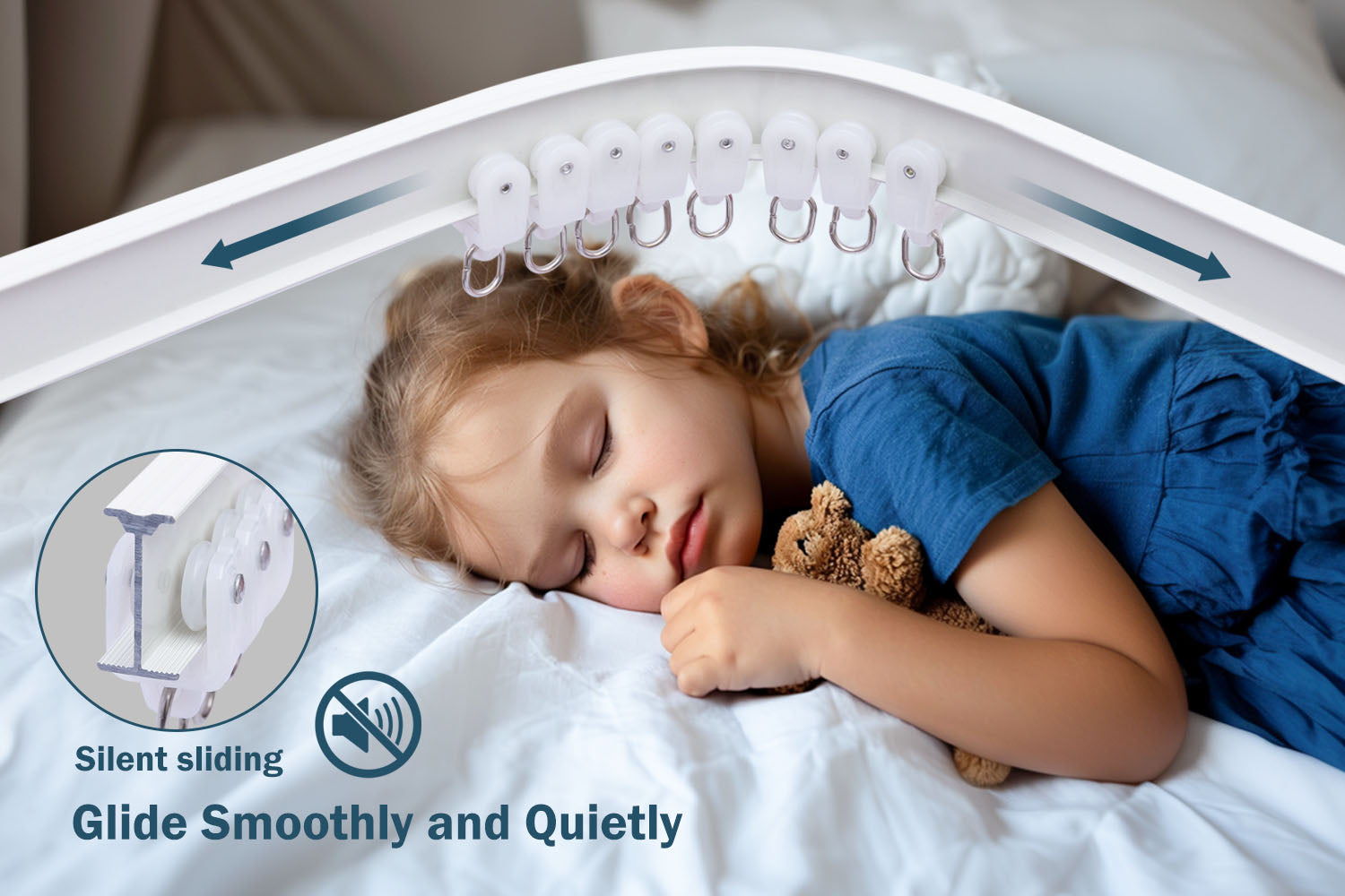 Curtain tracks have a perfect appearance, the tracks are made of thickened aluminum alloy, the thickened mounting brackets and connectors made of aluminum alloy are very strong and durable, the pulleys made of PET can carry heavier things, and they are very quiet.