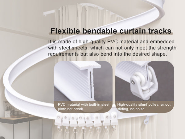 - Flexible Ceiling Curtain Track: made of high quality thickened PVC and embedded metal plates, paired with silent pulleys for quieter and smoother curtain operation,it can be bent into various shapes such as U-shape, L-shape, I-shape to suit various scenes